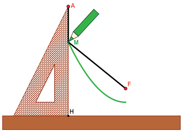 Tracer un cercle au compas s’apprend dès le plus jeune âge et on y arriverait sans trop de peine avec une ficelle et un crayon. Peut-être savez-vous déjà tracer une ellipse avec une ficelle également (voir Tangente n° 221). On peut aussi obtenir une parabole mais il faudra ajouter à vos outils une règle et une équerre. Pour cela, choisissez une ficelle dont la longueur est égale à celle du côté de votre équerre (la longueur AH sur le dessin). Attachez-la au foyer F de la parabole et à l’extrémité A de votre équerre. Calez l’équerre sur le bord d’une règle qui jouera le rôle de directrice. Faites alors glisser l’équerre le long de la règle en tendant la ficelle avec un crayon. Vous verrez ainsi se déployer en action la définition par foyer et directrice de la parabole puisque MH = MF. Si votre ficelle n’est pas de la même longueur que le côté de l’équerre, la construction est encore possible de façon similaire mais il vous faudra réfléchir à la façon de positionner la règle parallèlement à la directrice.
