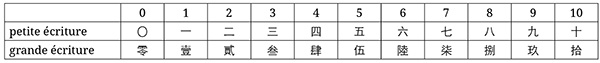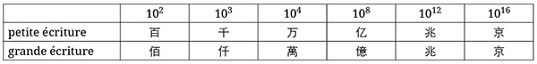 De nos jours, deux manières d’écrire les nombres existent : la numération « petite écriture » (xiaoxie ), qui est relativement simple et est utilisée au quotidien, ainsi que la numération « grande écriture » (daxie ), dont la complexité la rend moins falsifiable, d’où son usage pour les opérations financières (par exemple sur les chèques, tout comme nous qui écrivons les montants en toutes lettres). Cette dernière a été mise au point sous l’impératrice Wu Zetian (règne : 690-705) puis retravaillée sous Hongwu (règne : 1368-1398). Voici donc comment s’écrivent selon ces deux traditions les nombres dont la prononciation a été vue précédemment :