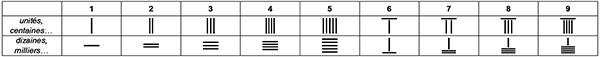 Les mathématiciens de langue chinoise représentaient de façon concrète les nombres par des baguettes en bambou (un peu comme les cailloux de l’Antiquité grecque (psephoi) ou romaine (calculi)). On a alternativement des baguettes verticales et horizontales pour éviter toute ambiguïté sur la position, deux paquets successifs de baguettes parallèles indiquant un espace vide (en fait, un nombre impair de « zéros », si l’on peut dire !). Cette notation, dite « des baguettes de calcul » (suanchou) est attestée dès le Ier siècle avant J.-C (et existait probablement dès le IIIe siècle) soit environ mille ans avant les premières traces que l’on possède de la numération indienne !