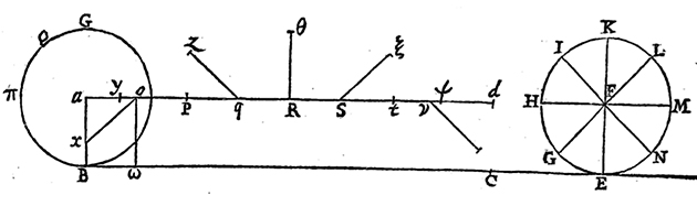Dans les années 1620, Marin Mersenne s’intéresse au paradoxe de la roue du pseudo-Aristote, à savoir que deux cercles parcourent des espaces proportionnels à leurs diamètres, tandis qu’ils parcourent un même espace s’ils sont solidaires et de même centre.
