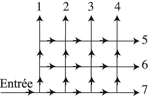 Le réseau représenté ci-dessous est parcouru par des particules. Ce réseau comporte une seule entrée et sept sorties, numérotées de 1 à 7. À chaque intersection, le tiers des particules va vers la droite et les deux tiers vers le haut.