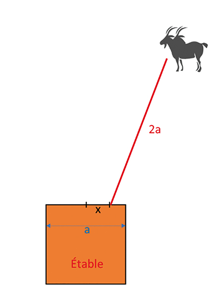 – Déjà, fait remarquer Epsilon, le calcul sera plus facile avec une longe qui ne fait pas plus du double du côté de l’étable. Pas besoin de dégainer des arcs cosinus.