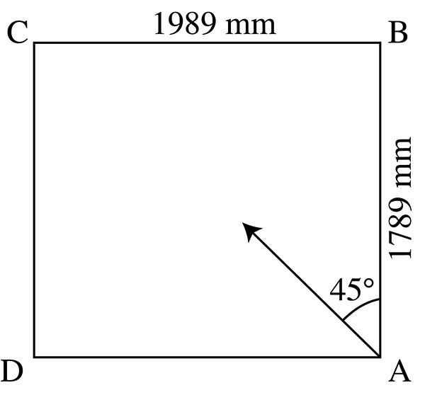 Une boule de billard part de l’angle  d’un billard rectangulaire de 1789 mm sur 1989 mm, selon la bissectrice de l’angle Â. Elle poursuit sa route sans perdre d’énergie, en rebondissant sur les côtés, jusqu’à atteindre l’un des quatre angles.