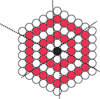 On peut compter les cercles un à un, mais il est plus simple (et plus sûr) de remarquer que la structure est composée d’un cercle central entouré de six triangles de base cinq cercles. Le nombre total de cercles est donc égal à :